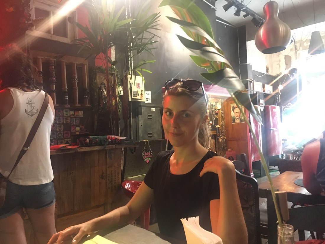 Dans le premier café qui vient, nous dégustons un plat local poulet/frites /riz/haricots rouges. (Et en plus des petites frites d’aubergines vertes, délicieuses! )