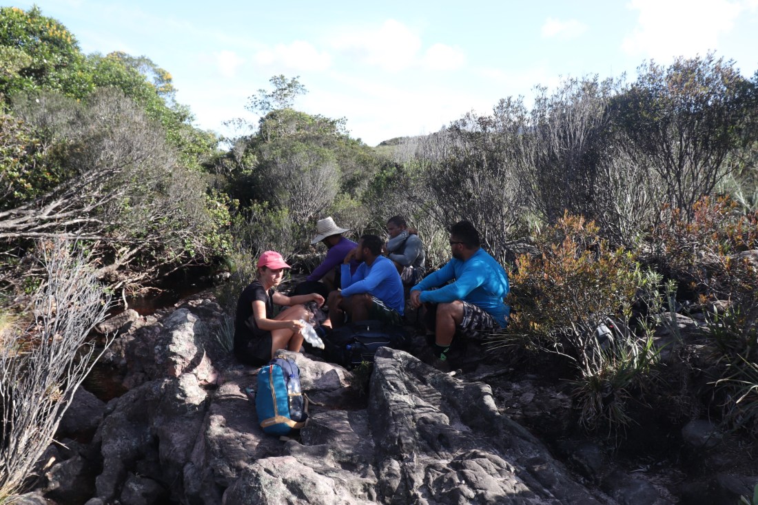 Apres le petit-déjeuner (avec notamment, une sorte de gâteau de semoule de maïs) le guide nous conduit à un refuge proche car on change de groupe aujourd’hui. Les brésiliennes restent 5jours et auront donc un autre programme. Notre nouveau guide ne parle pas anglais, les trois garçons brésiliens avec lui non plus, heureusement qu’on maîtrise la langue des signes maintenant!