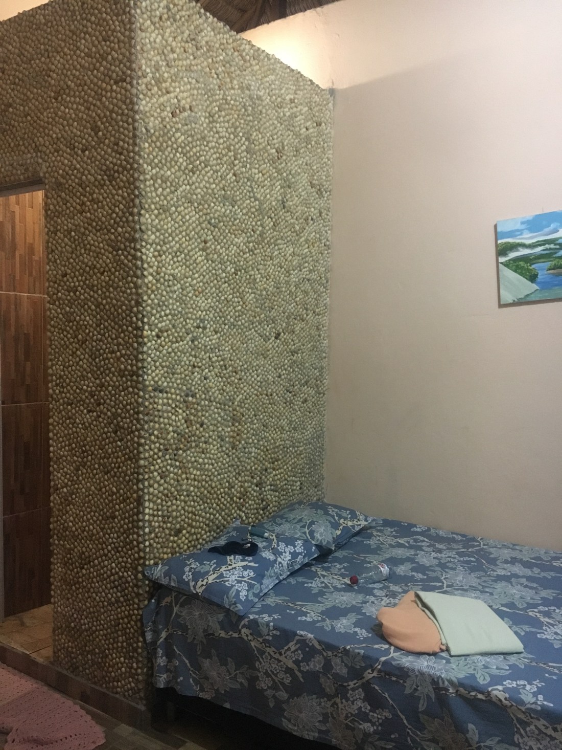 Nous découvrons ensuite notre chambre, un mur est recouvert de coquillages, ce qui n’est pas sans nous rappeler la féerie des coquillages de l’aquarium de Granville !