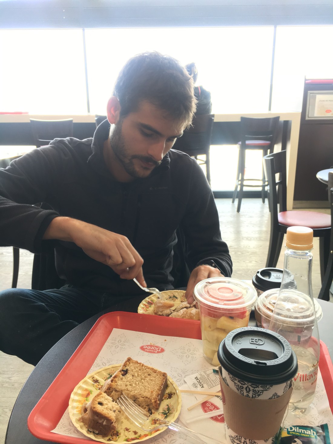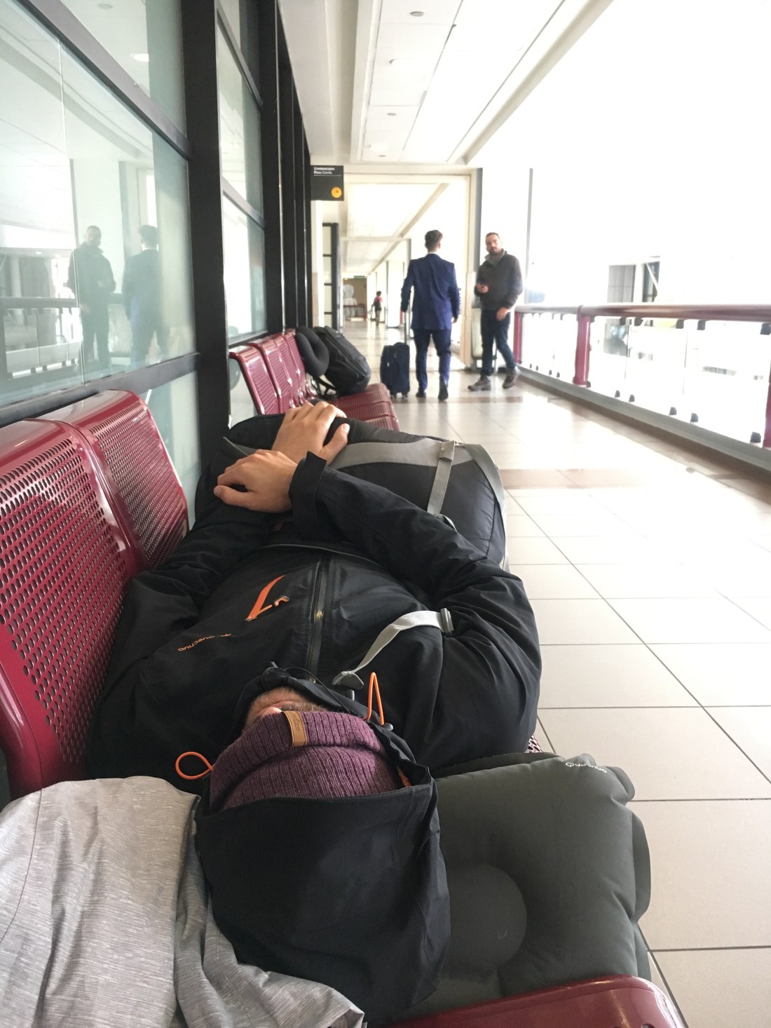 La compagnie change notre billet pour 12h50et nous offre même un petit-déjeuner chez brioche dorée. On dort un peu sur des bancs, prenons le fameux petit déjeuner et embarquons.