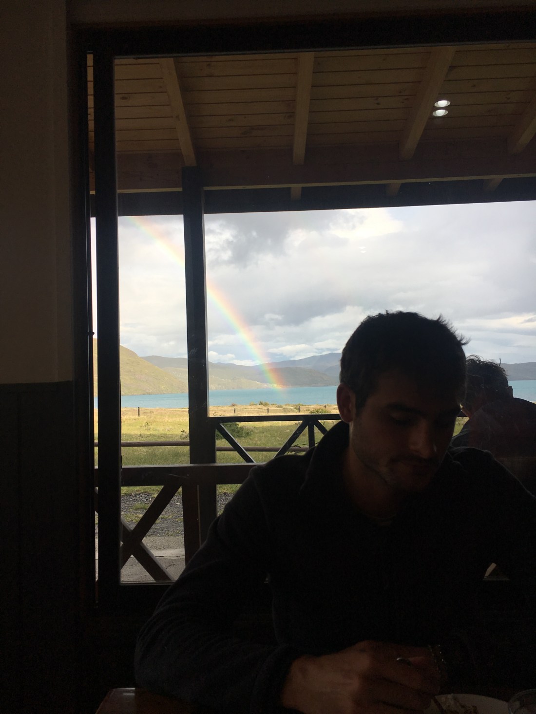 La vue est superbe sur le lac Pehoé, pendant le dîner il pleut un peu et nous avons droit à un bel arc-en-ciel.