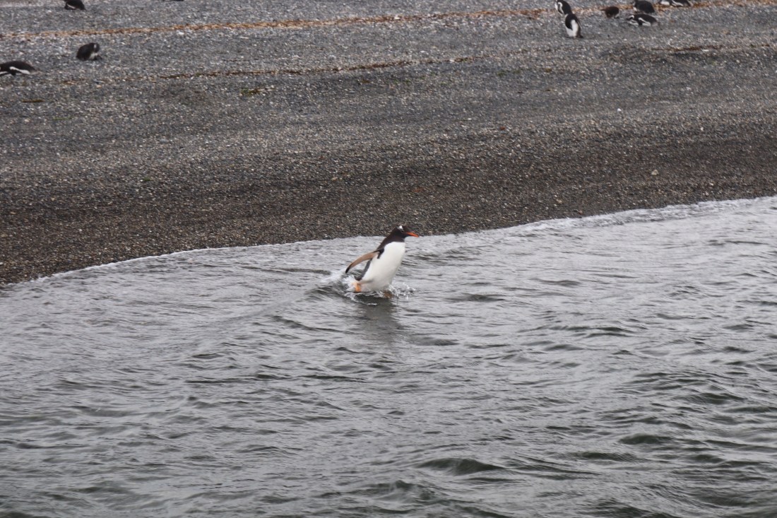 Juste à côté nous apercevons quelques manchots papous, plus grands avec le ventre bien blanc. C’est une colonie permanente sur l’île, il y en a 14.