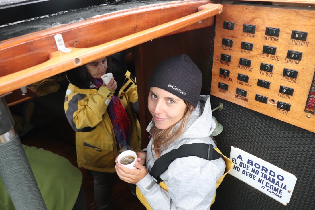 Puis nous continuons la navigation ponctuée de pauses à l’intérieur pour se réchauffer et boire un thé.