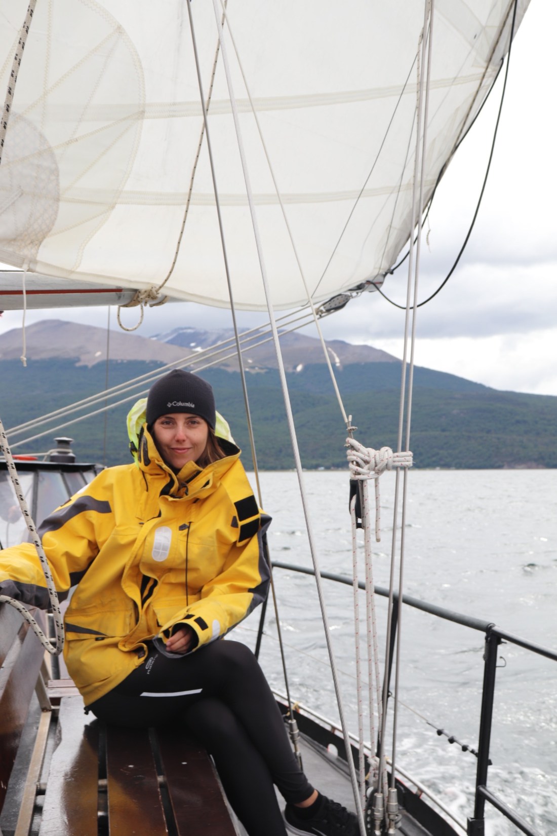 En fait le tour en bateau commence par 1h de van, puis nous arrivons sur un petit port et embarquons sur un voilier. C’est super car nous ne sommes que 8 touristes, avec un guide et le capitaine. Dès le départ il fait très froid et nous enfilons rapidement le pantalon et la veste de quart proposés par le guide.