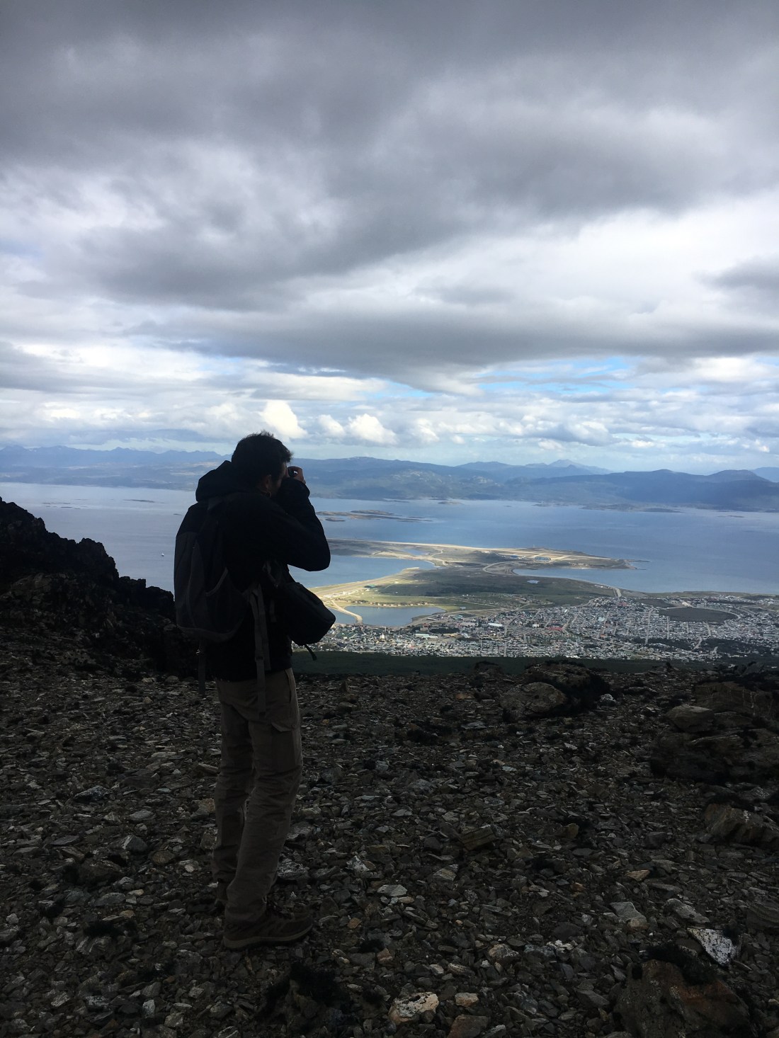 Après 2h de montée nous voici sur une des montagnes qui surplombent Ushuaïa, la vue est superbe. Et haut un vent glacial souffle, nous sommes transits de froid, heureusement nous avons prévu du thé !