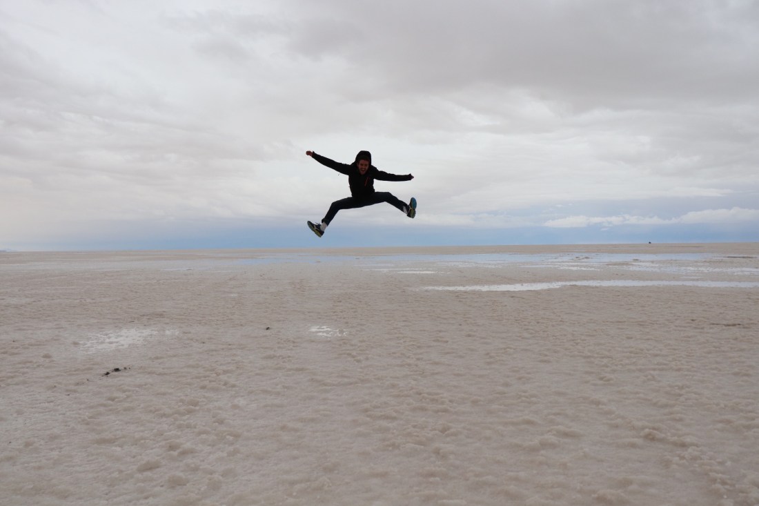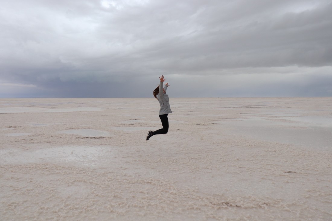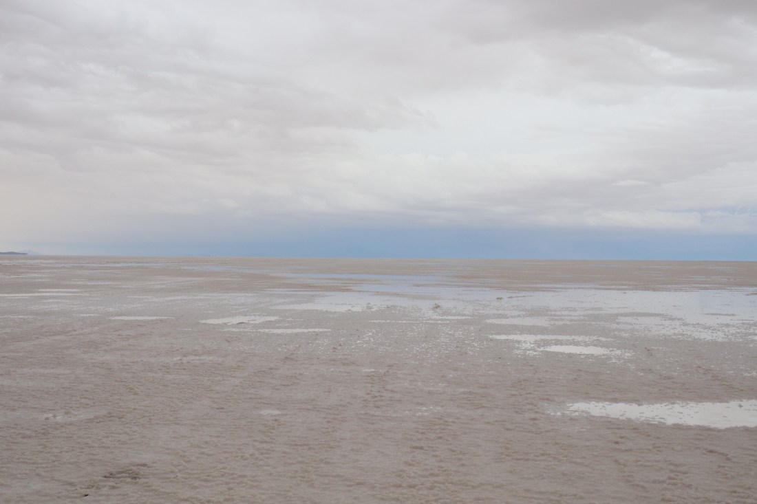 Après 15 minutes de route, nous voici sur le Salar sous la pluie. C’est tout de même très beau et la pluie s’arrête même un peu le temps de quelques photos.