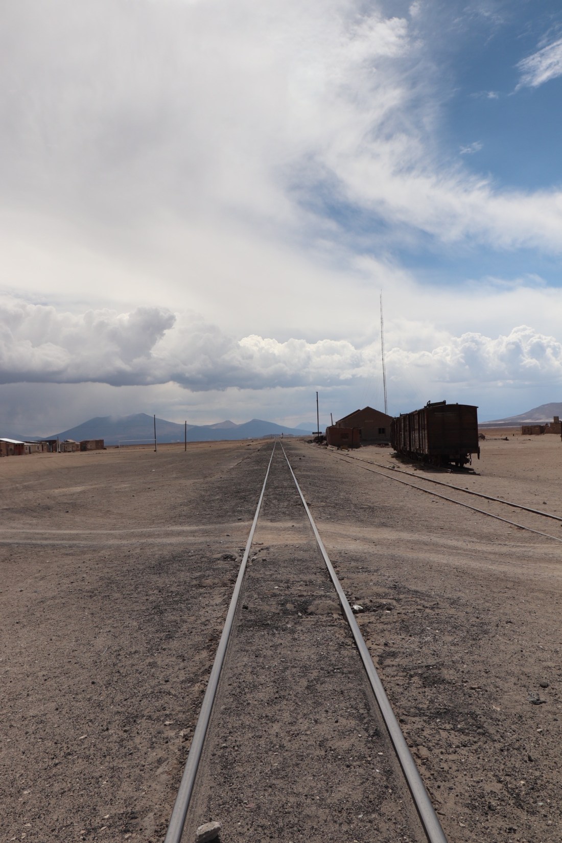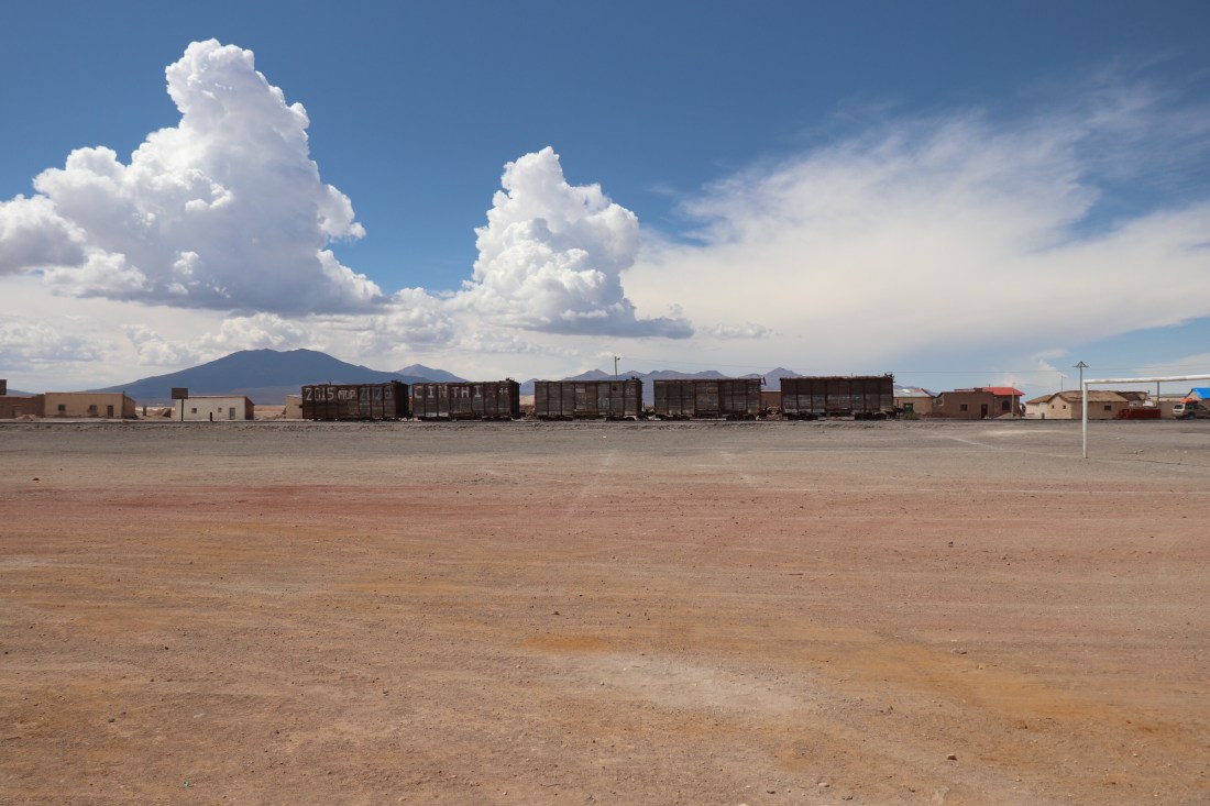 Nous reprenons la route, la vue est magnifique mais soudain le temps se gâte et il se met à grêler ! Heureusement le temps s’est découvert lors de notre prochain stop. Un village traversé par une ligne de chemin de fer, encore utilisé, principalement pour l’extraction de minéraux. Le chauffeur nous laisse attendre, assez longtemps, sur la terrasse d’un petit bar, l’occasion pour Paul de tester la bière au quinoa.