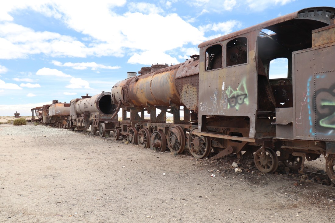 Bien repus, nous nous dirigeons vers la dernière étape: le cimetière de trains d’Uyuni. En fait il s’agit plus d’une décharge de vieux trains mais c’est tout de même assez impressionnant.