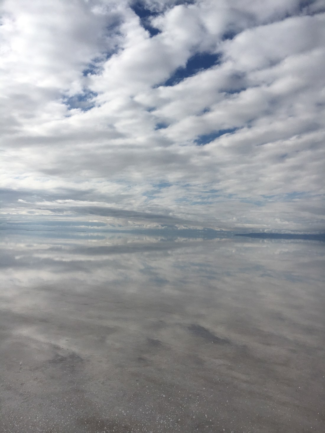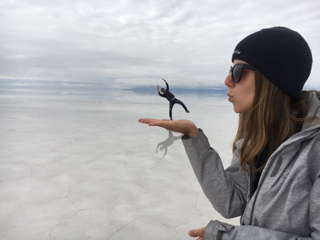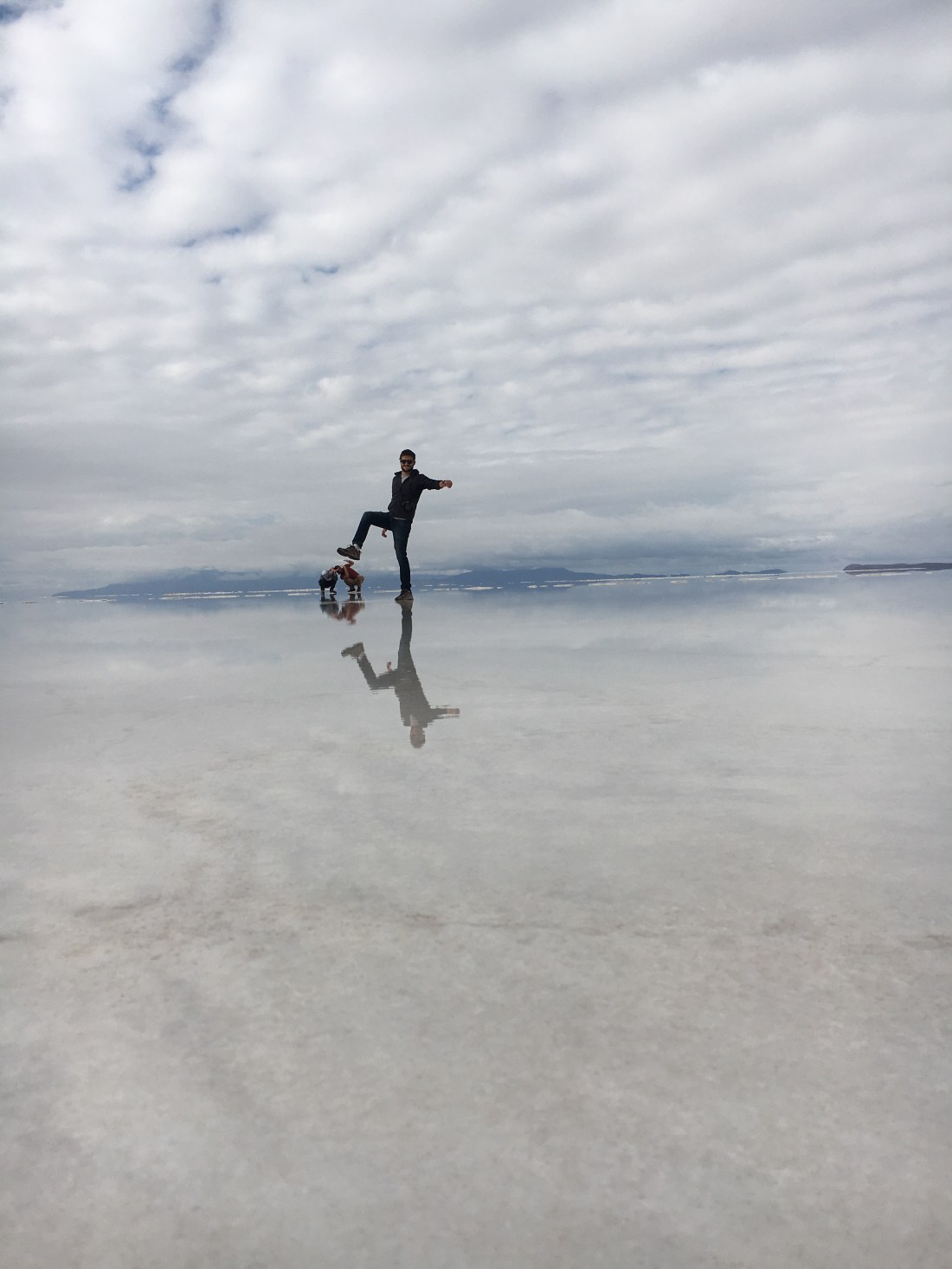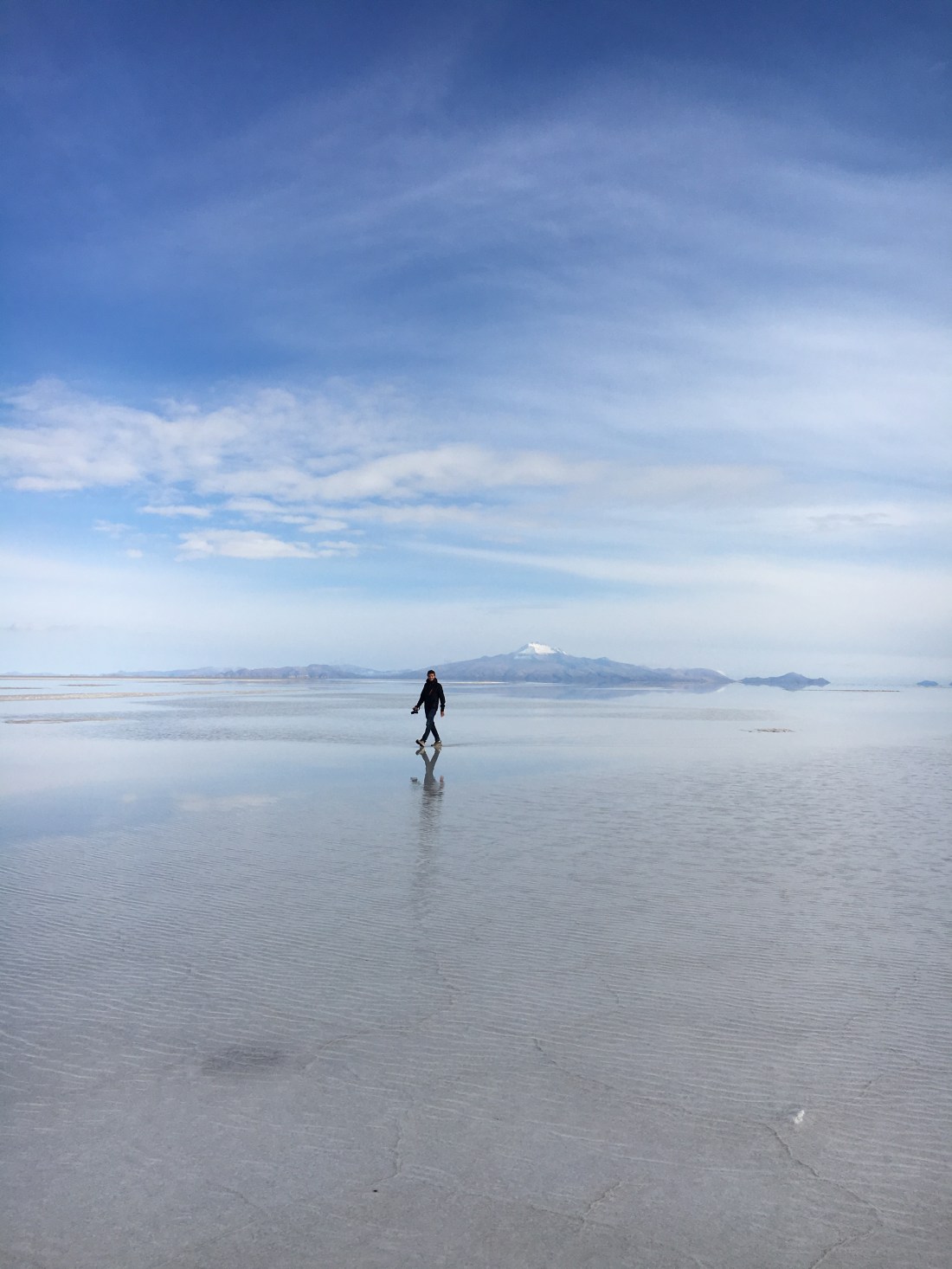 Après une petite séance photos sur un miroir d’eau, nous recommençons à rouler sur le Salar. Le décor est fantastique entre le rêve et un film d’animation japonais .