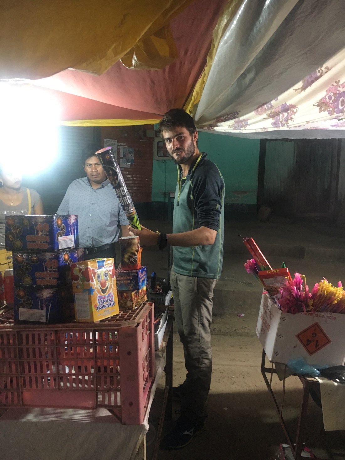 Il n’y a quasiment personne dans les rues et les bars, en fait ici la fête commence à minuit. On se prépare donc pour les 12 coups de façon locale,en achetant des petits feux d’artifice. A minuit pile c’est l’effusion de lumières, Feliz año Nuevo!