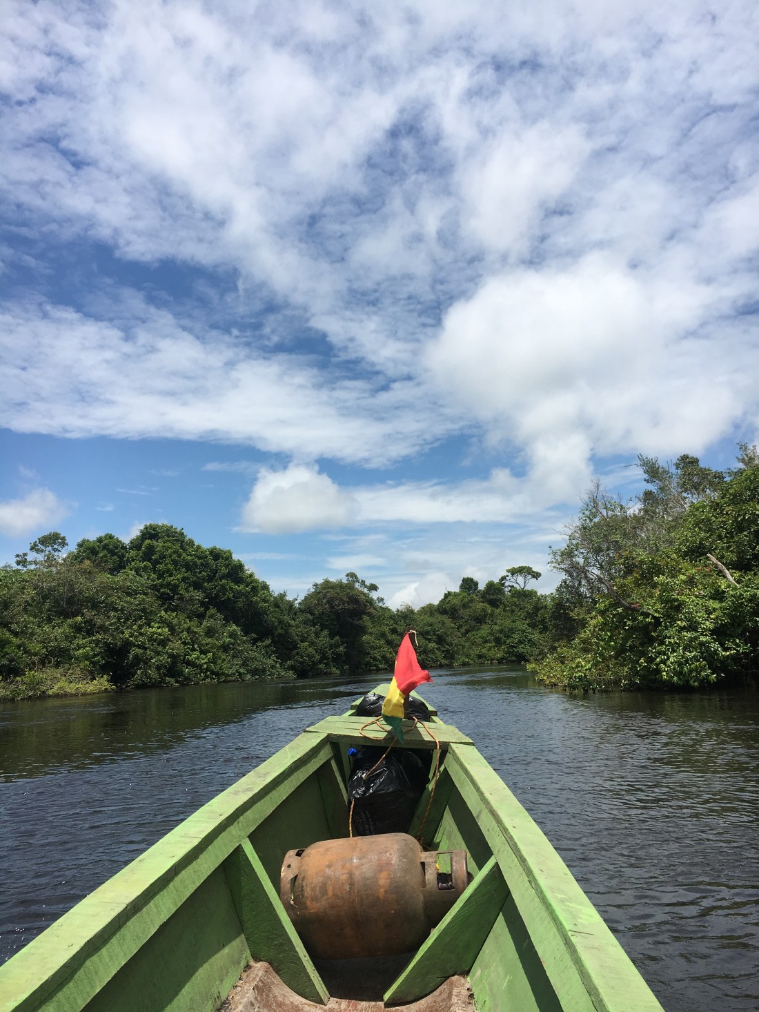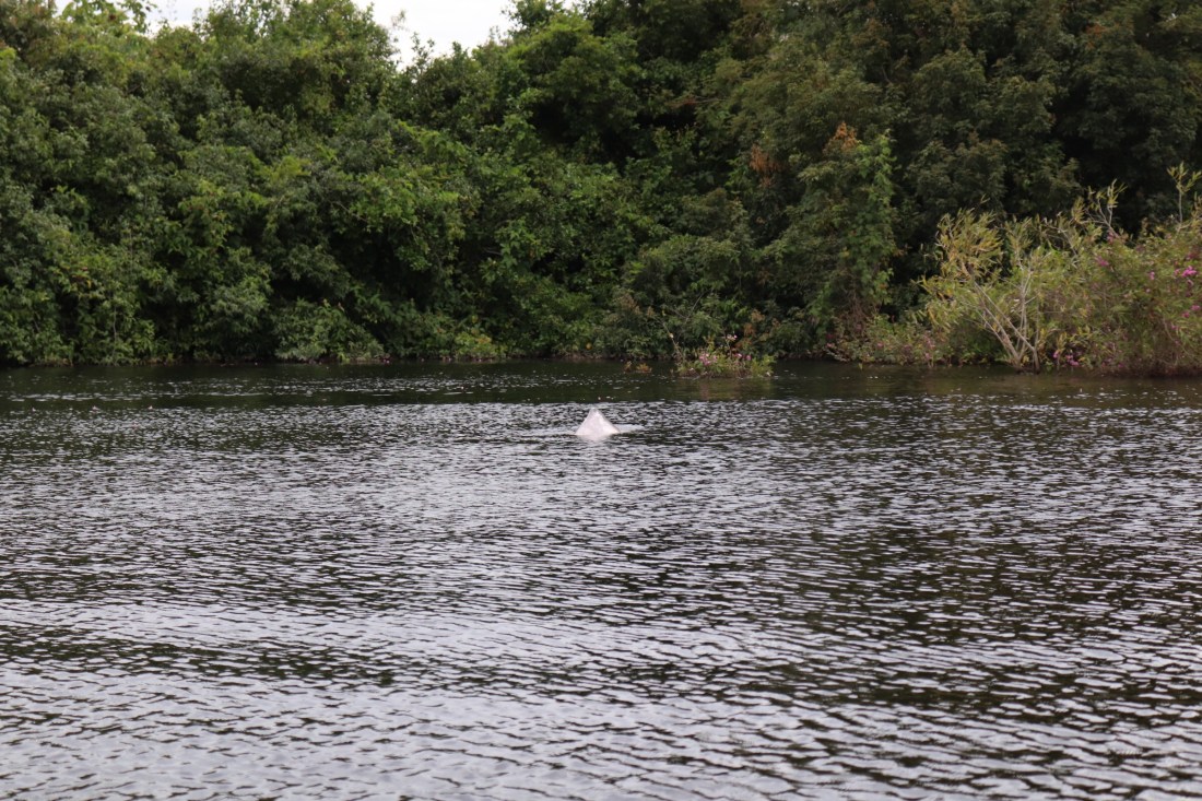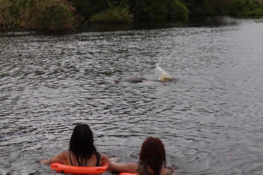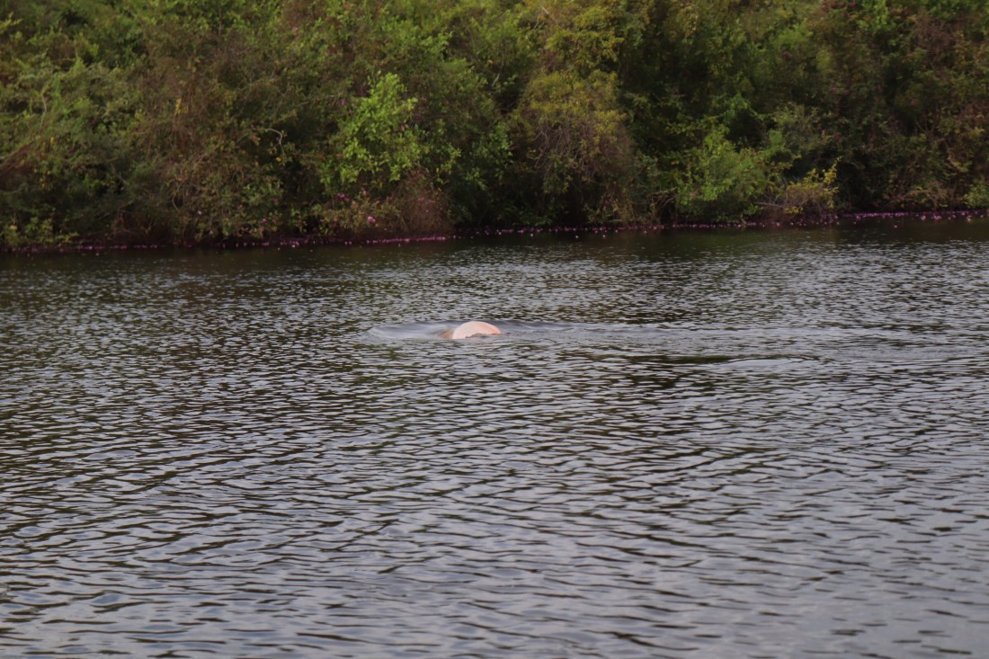 Nous nous arrêtons dans une sorte de bassin naturel au milieu de la rivière. On constate qu’en effet les dauphins sont bien là, on leur lance une bouteille d’eau vide pour qu’ils jouent avec (nous la ramasserons après bien sûr).