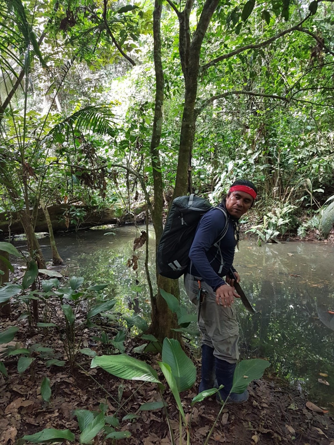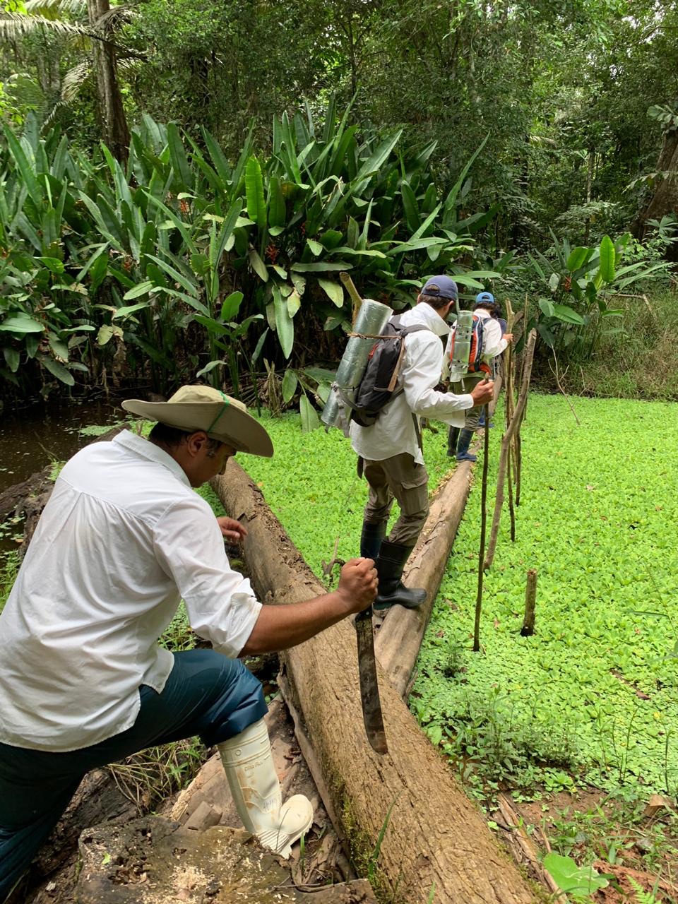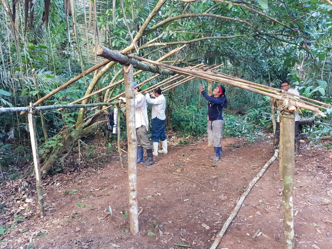 Au bout d’un moment le guide leur montre l’endroit pour le camp du soir, proche de la rivière. Ils entament alors de tout nettoyer puis de couper à la machette des arbres, des bambous et un palmier, pour se construire un véritable palace.