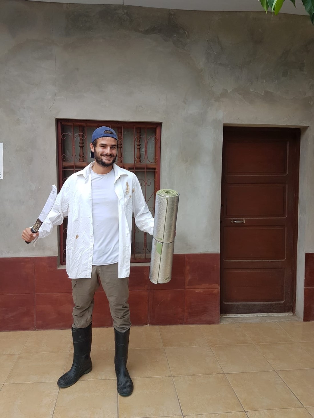 Après un petit-déjeuner rapide j’accompagne Paul à l’agence où on lui remet une chemise, une moustiquaire, une paire de bottes, un matelas et la fameuse machette. Le voilà prêt à partir.