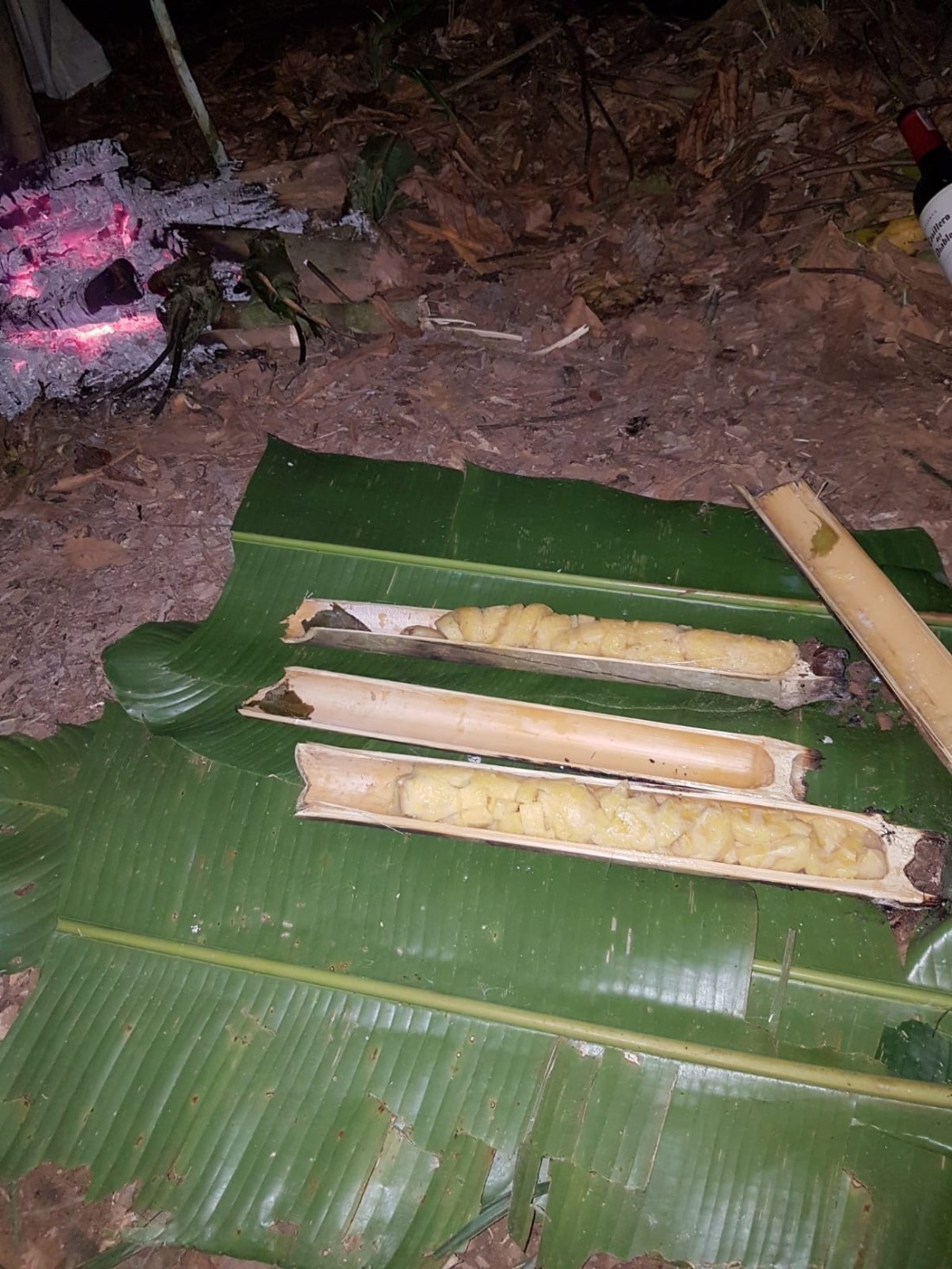 Ils reviennent bredouille mais sur le chemin du retour le guide avise un bananier et charge Paul de couper l’arbre. Ça sera leur dîner, cuit à l’étouffé dans des bambous.