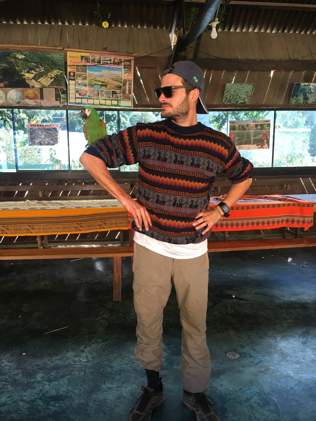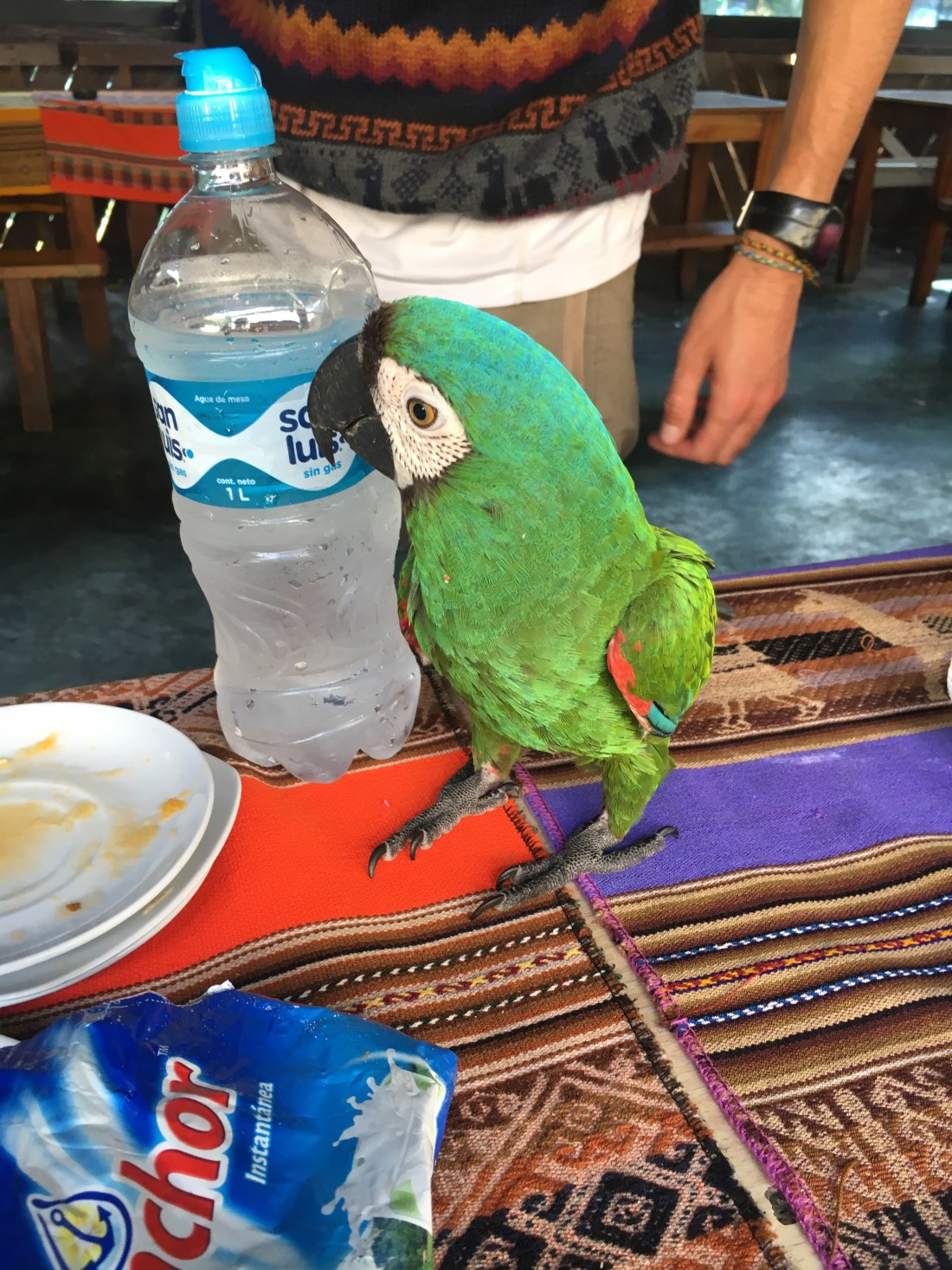 Pendant le petit-déjeuner, Paul se fait copain avec un habitant du camping, un beau perroquet.
