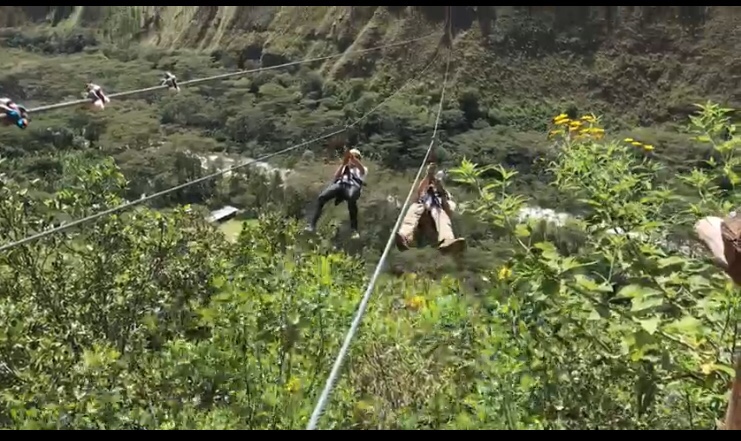 C’est parti pour 3 tyroliennes déjà très impressionnantes. Puis on enchaine avec l’escalade d’une paroi devant une cascade, 1 autre tyrolienne, un pont de singe très très long, et les deux dernières tyroliennes (dont la plus longue du Pérou).