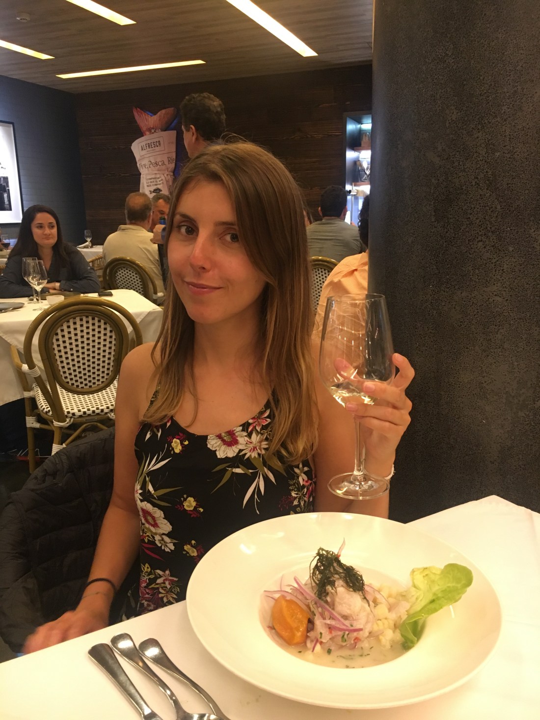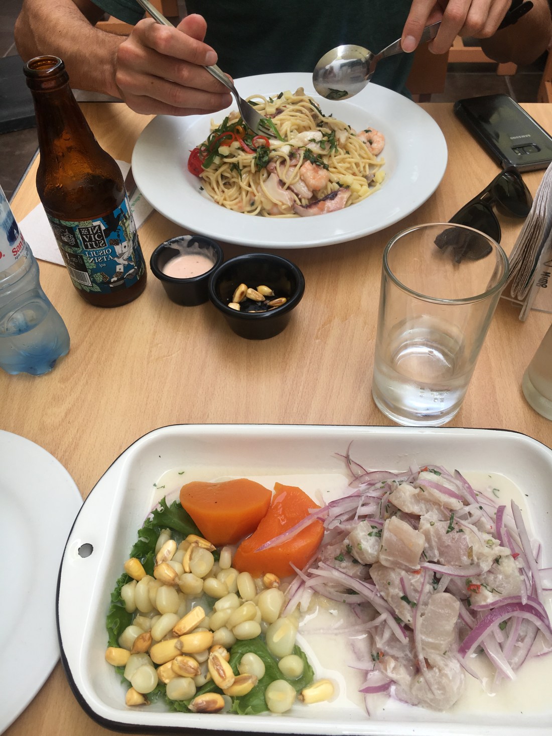 Notre premier stop est un restaurant à Ceviche, et oui il est 15h et nous n’avons toujours pas déjeuné. Paul opte pour des pâtes aux fruits de mer et moi pour un Ceviche classique.