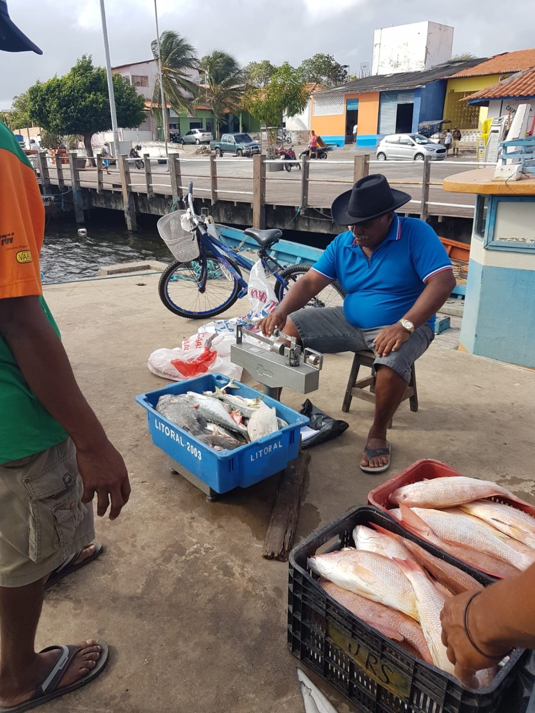 Bref nous embarquons pour 1h30 de route sur une piste chaotique, heureusement que nous n’avions pas mangé avant ! Enfin nous traversons un fleuve, et arrivons à Barreîrinahs. Notre transfert n’est que 1h30 plus tard. Nous prenons un petit déjeuner local, un café trop sucré, un croissant fromage-jambon pour Paul et une part de gâteau nature pour moi. Nous nous promenons sur le bord du fleuve, il est à peine 8h et les pêcheurs reviennent de mer, nous assistons donc à la criée !