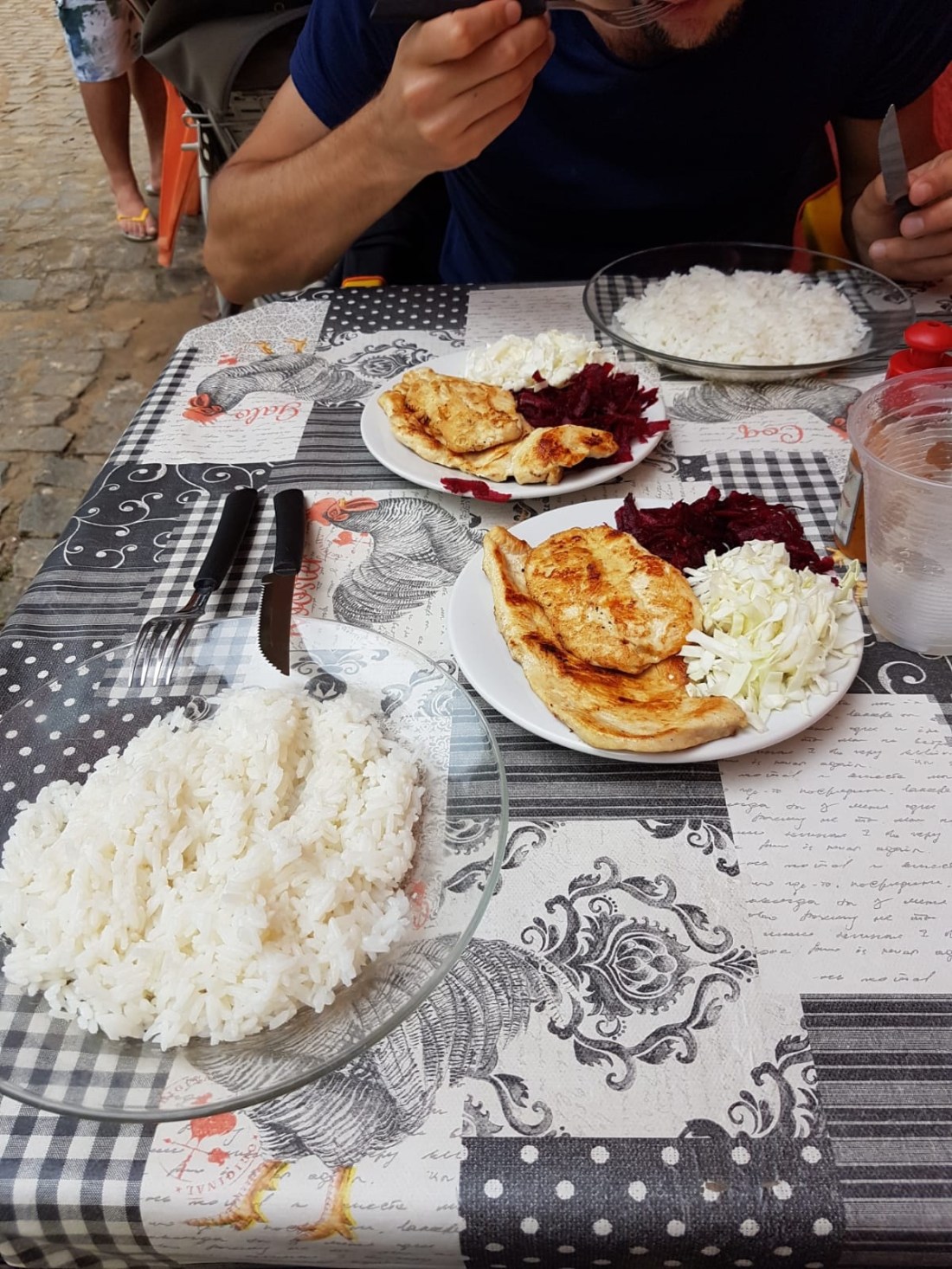Le dîner est très brésilien, c’est à dire féculents et gras. Ce soir c’est pâtes pesto, pommes de terre avec un peu de courge, et poulet.